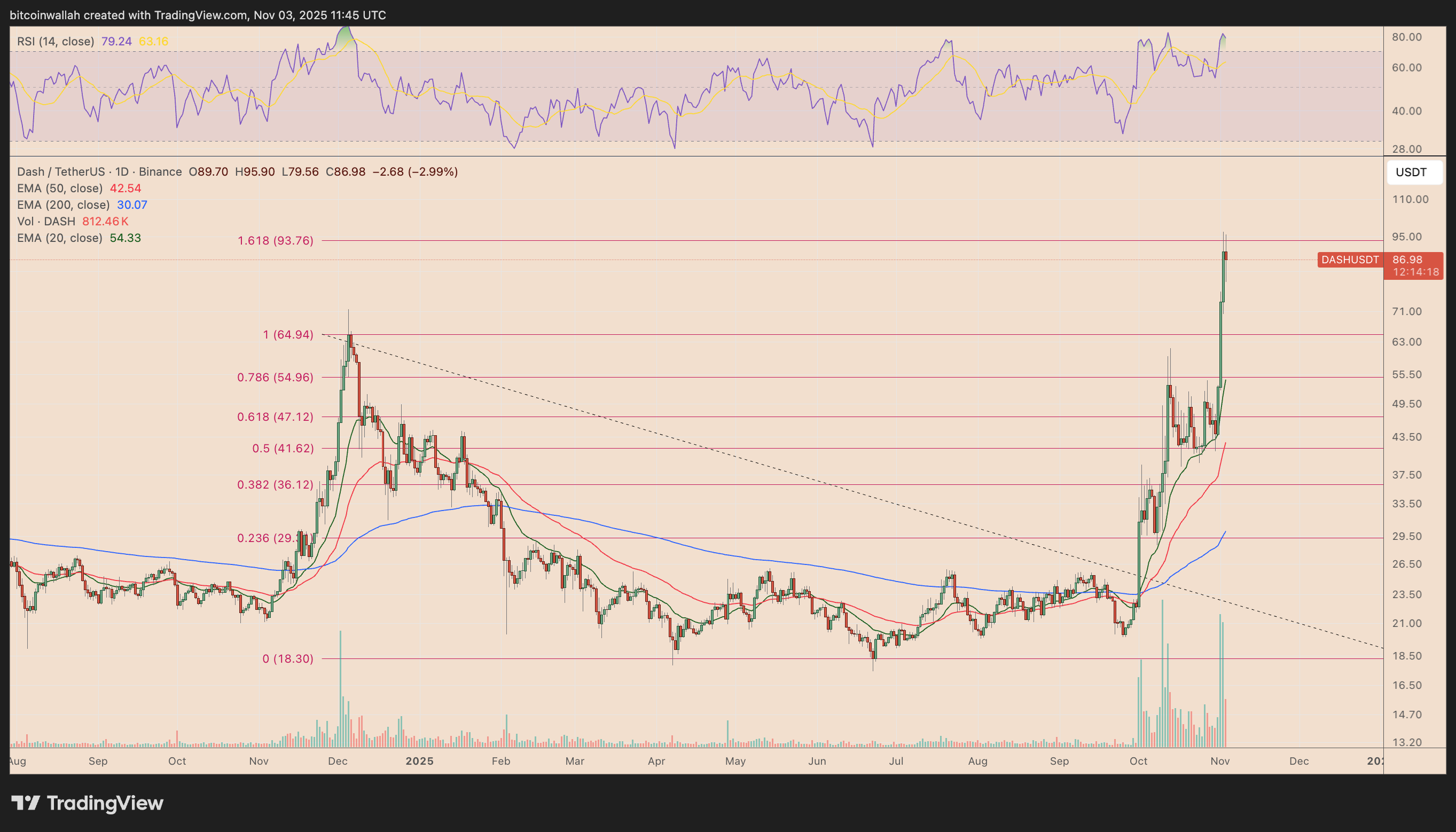 DASH’s explosive rally has pushed its daily RSI above 79, signaling heavily overbought conditions and raising the risk of a short-term correction.
