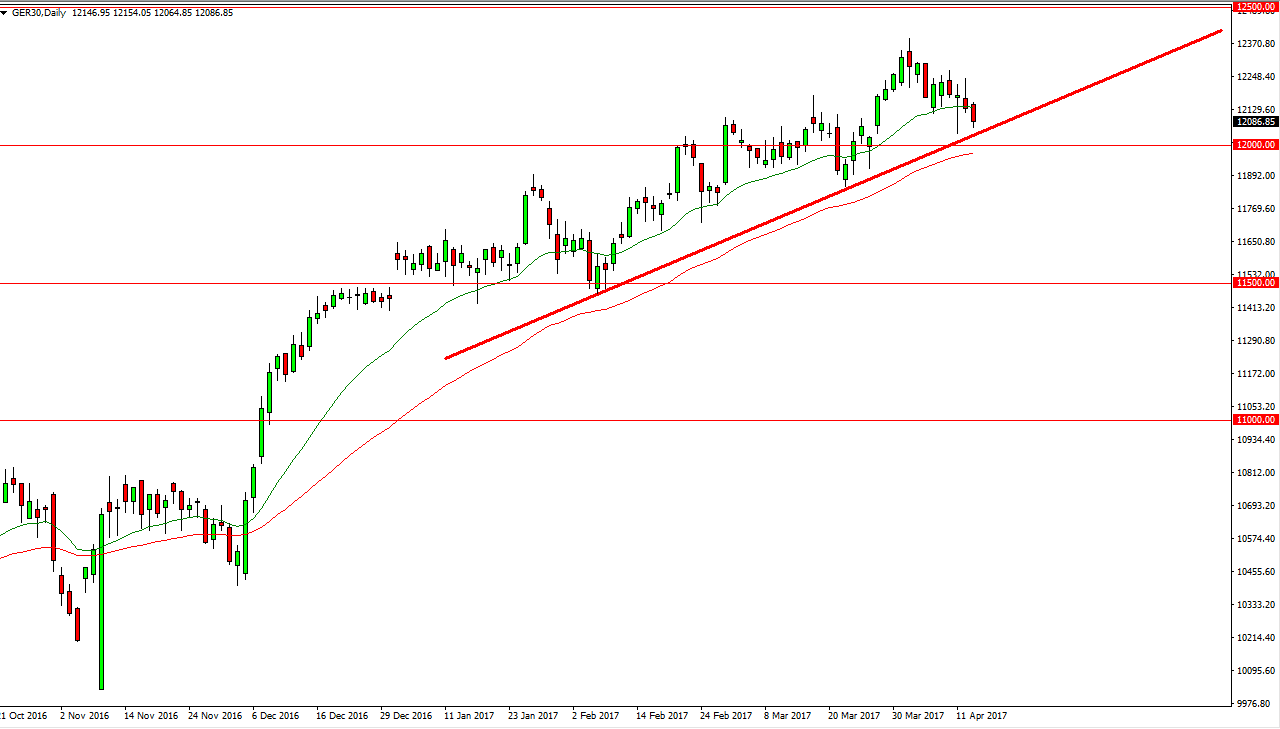 The German index fell slightly during the day on Thursday, but was still closed on Monday. That being said, we are testing a significant trend line and a