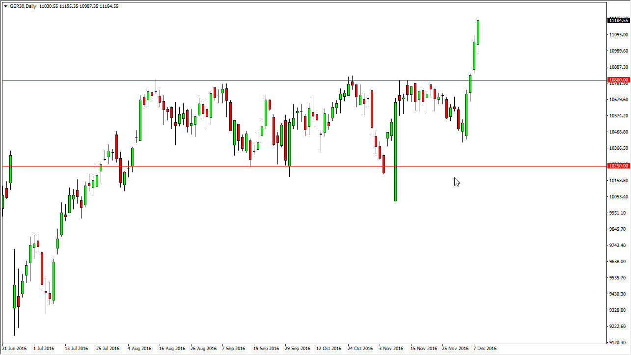 The DAX rose during the day on Thursday, testing the €11,200 level above. It looks as if we could pullback, in order to build up more momentum as we have recently broken out. I believe that the €10,800 level below should be essentially a “floor” in this market. With this, I believe that the buyers continue to enter this market, as we most certainly have seen a massively bullish move. With the Euro falling quite drastically, it suggests that the DAX should continue to benefit from cheaper currency as far as exports are concerned.