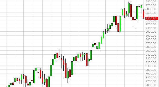 The German index fell during the week, closing at the €9350 level. There is a significant amount of support below though, so we are not looking to sell
