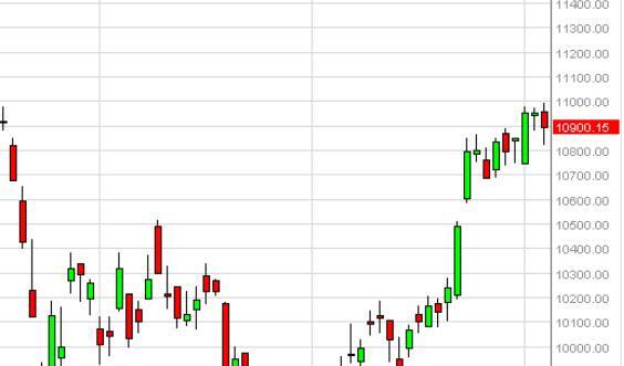 All things being equal, we are buyers and we have no interest in selling because we think that the €10,500 level will be essentially a “floor” in this marketplace. That floor very likely won’t be broken, and with this I believe that pullbacks offer value that have to be taken advantage of. Ultimately with fact, the market then reaches towards the highs yet again but keep in mind that there will more than likely be a lot of volatility between now and then. After all, the European Union continues to suffer in general, and although things are looking better, there are still a lot of potential headline scares out there that could move the market. On top of that, you have to keep an eye on the Euro, as if it suddenly starts to strengthen that could be a bit of an anchor around the necks of the European indices going forward.