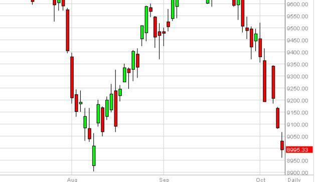The DAX as you can see gapped lower at the open on Wednesday, breaking down below the 9100 level decisively. We actually closed just below the 9000 level, and that of course is a fairly negative sign. The lows back during the month of August were found that the 8900 level, and as a result if we can get below there we think that this market will accelerate to the downside, perhaps going as low as €8500 before it’s all said and done. On a daily close below that level, we are more than willing to start selling. On the other hand though, we formed a supportive candle near there, it could be a nice long-term buying opportunity.