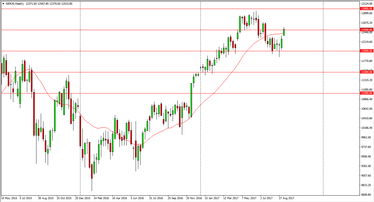 The German index gapped higher at the open on Monday, and then broke towards the €12,500 level. If we can break above the top of the candle for the week,