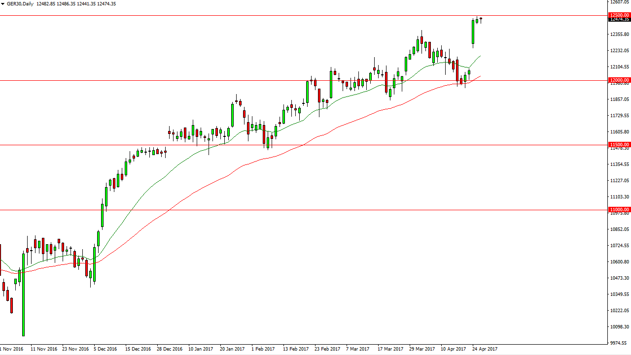 The DAX Index initially fell during the day on Wednesday but turned around to form a very supportive candle. Because of this, I think that were going to try to make a breakout above the €12,500 level, and continue to go much higher. If we do, I feel that the next target will of course be the round number of €12,600. A pull back from here should find plenty of support underneath anyway, so this is a “buy only” market as far as I can see. I look at pullbacks as nice value waiting to happen.