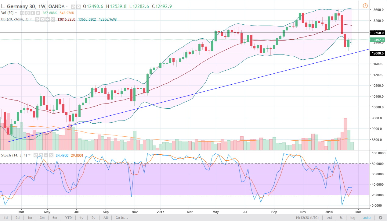 The German index initially fell during the week but turned around to find enough support to bounce and form a nice-looking hammer. The hammer of course is a bullish sign, and a break above the top of the hammer is a buy signal. The €12,750 level above should be resistive, and I think that given enough time we are likely to see the market try to break above there. If we do, then I think the next target will be the €13,000 level. Even if we do break down below the bottom of this hammer, I think that there is plenty of support near the uptrend line and more importantly, the €12,000 level to keep this market going higher.