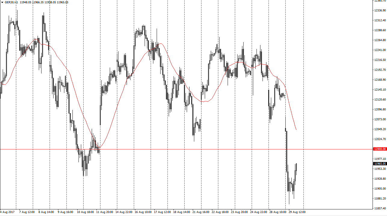 The German index gapped lower at the open on Tuesday, and then fell through the €12,000 level. I think that most of this is due to the EUR/USD pair