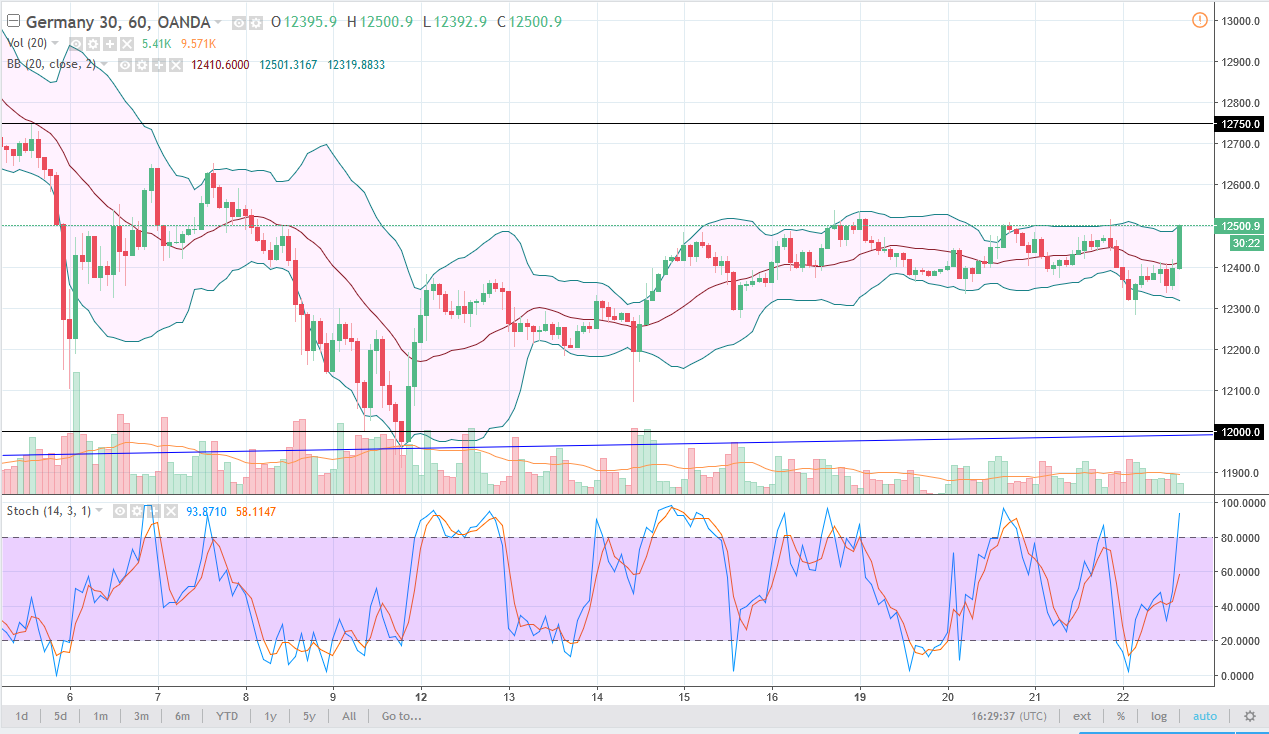 The German index rallied during the trading session on Thursday, reaching towards the €12,500 level. This is an area that has been important over the last several sessions, but if we can break above there I think that the momentum will carry us forward.