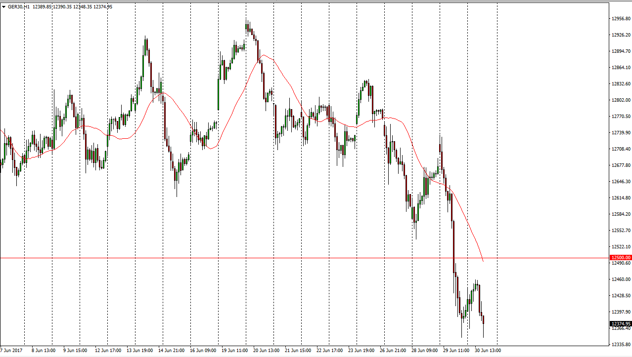 The DAX initially tried to rally, but then turned around to fall significantly during the day. We are testing a supportive area, but if we break down below the bottom of the session during the day we could go much lower, perhaps reaching towards the 12,300 level. I think that the market will more than likely continue to show resistance, but if we can break above the 12,500 level, the market should continue to go much higher. A lot of the selloff has been due to the EUR/USD pair rallying significantly, working against the value of the German exports.