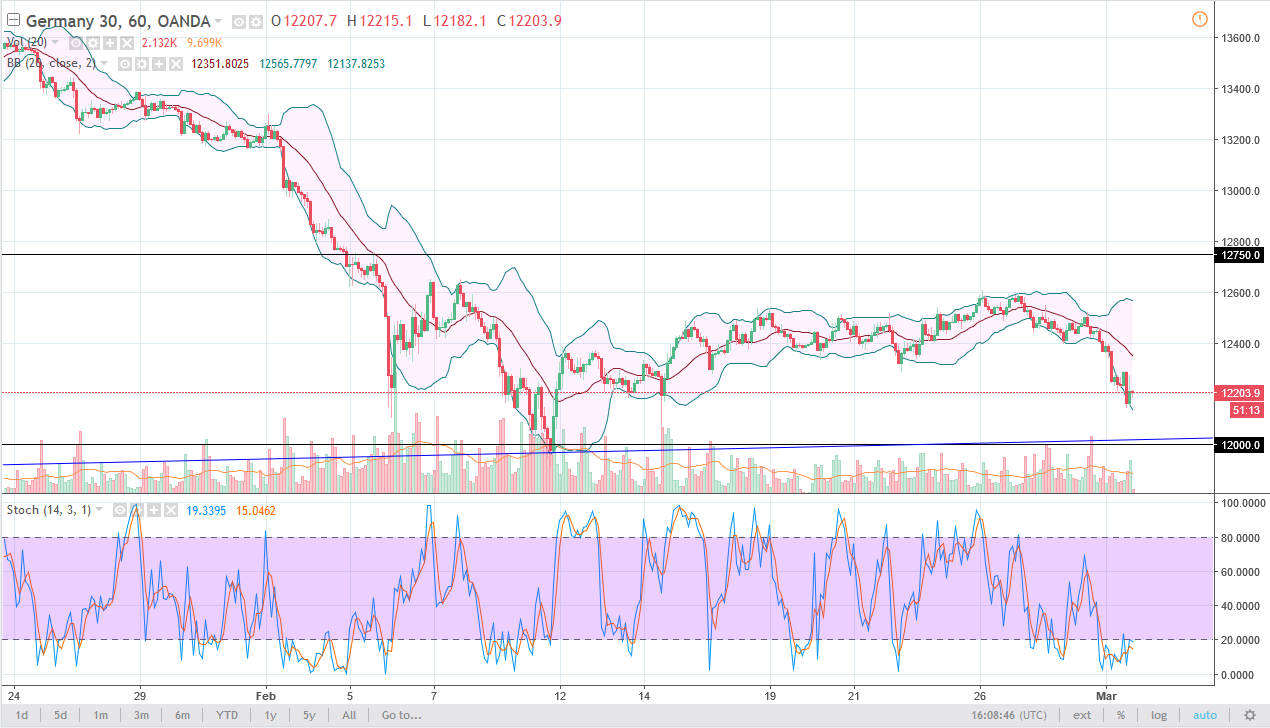 The German index fell during the trading session on Thursday as most stock markets did. Ultimately, I believe that the market is going to find plenty of support below, so I do not have any interest in shorting this market, and I believe that it’s only a matter of time before the buyers come in and pick up this market as being cheap.