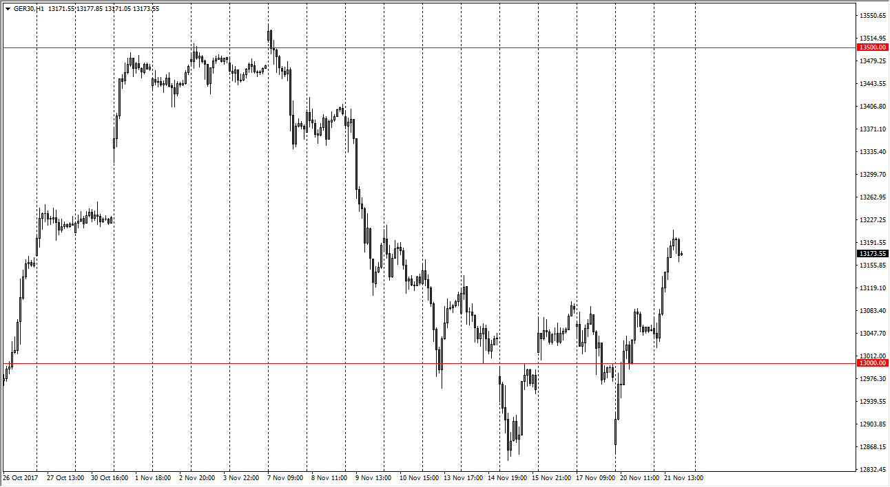 Keep in mind that the failure of the German government to form a coalition had a negative influence on the market and the short-term, but people bought that overreaction for the value that it was. Although I think is can be very noisy, I believe that the market should continue to be one that favors the upside, and eventually breaks out above the €13,500 level, extending to the €13,750 level. In general, I think that the EUR/USD plays a significant amount of influence on the market as well, as the economic outlook for the European Union. Right now, I believe that we are going to continue to go higher, and therefore I do like the idea of buying in small increments and simply adding as we go along. That is an excellent way to build up a larger position awaiting the longer-term move to the upside and a significant move that attracts a lot of “buy-and-hold” traders.