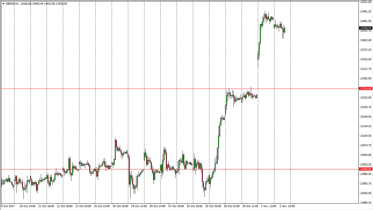 The German index gapped lower at the open on Thursday, but then pulled back slightly to reach towards the €13,400 level underneath. The way, I think that