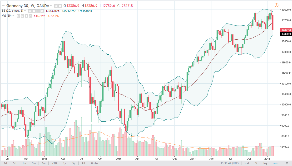 German traders sold off the stock market during the week, testing the vital support level just below. This is a very bearish candle, but the volume was an extraordinary, so is likely that the buyers are going to return reasonably soon.