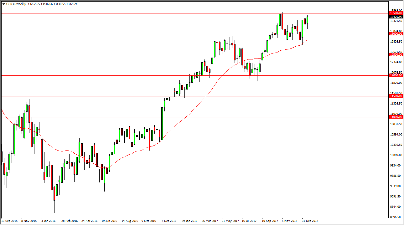 The German index continues to be very bullish overall, but we did initially pull back during the week. The market turned around, and reached towards the €13,450 level. If we can clear the €13,500 level, I feel that the market will continue to go higher, perhaps offering more of a “buy-and-hold” feel to it. I think that the market continues to find buyers on dips, as the DAX is the gateway to the European Union for most traders. The German economy is over 80% of the value of the U, so it makes sense that the German stock market will be a beneficiary of money flowing into the market.