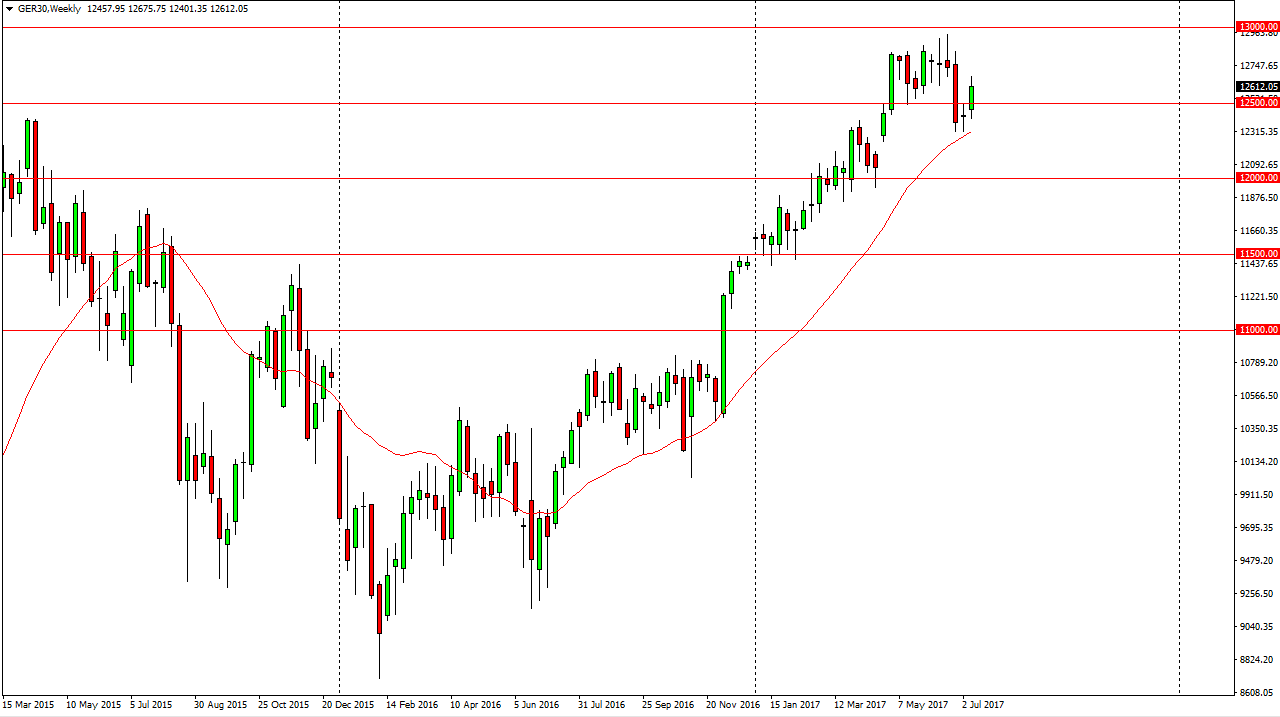 The German index broke higher during the week, slicing through the €12,500 level, which was previous resistance from the week before. The market looks as