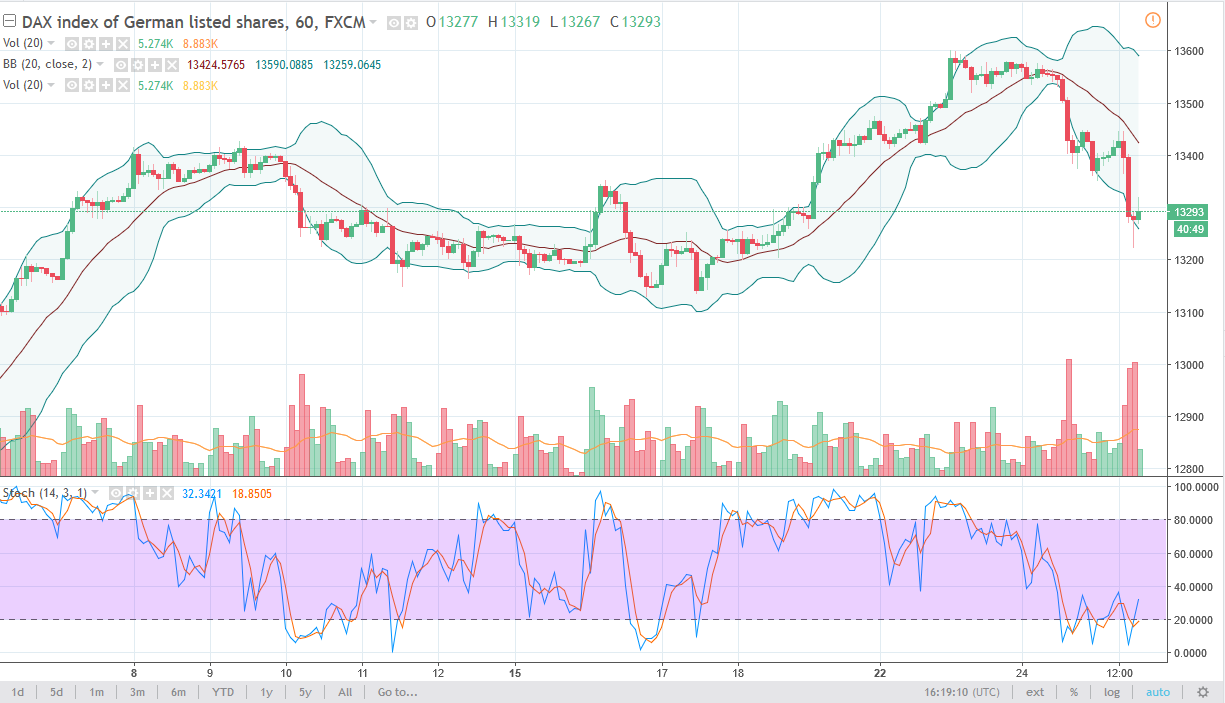 The German index went sideways initially during the day on Thursday, but then broke down rather significantly. As a record this, we are testing the €13,250 handle. I believe that the market should see plenty of support just below, so it’s likely that the buyers will continue to be aggressive underneath, so given enough time it’s likely that we will bounce.