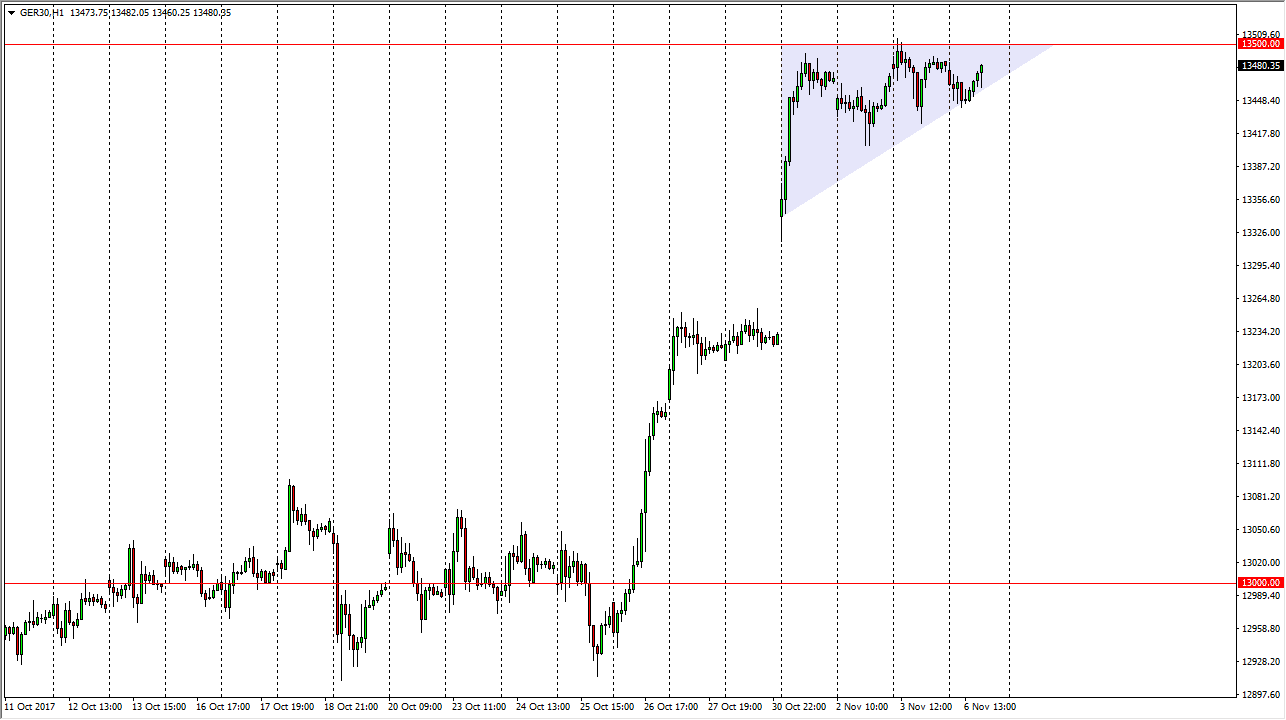 The DAX of course has been benefiting from the EUR/USD pair falling, as it makes German exports cheap. In fact, it’s one of the strongest correlations, negatively speaking, the DAX and the EUR/USD currency pair. I believe that the EUR/USD pair has a bit further to go to the downside, and I think this will continue to drive the DAX to the upside in general. I recognize that the €13,500 level is significant resistance, but the pattern is playing itself out quite nicely, so we should get a breakout rather soon. If we don’t, then I simply look at this market is one I will pick up on value, and I will step away and let buyers underneath tell me when it’s time to get involved. I have no interest in shorting this market, so therefore it simply a matter of buying a breakout, or waiting for value to present itself yet again.