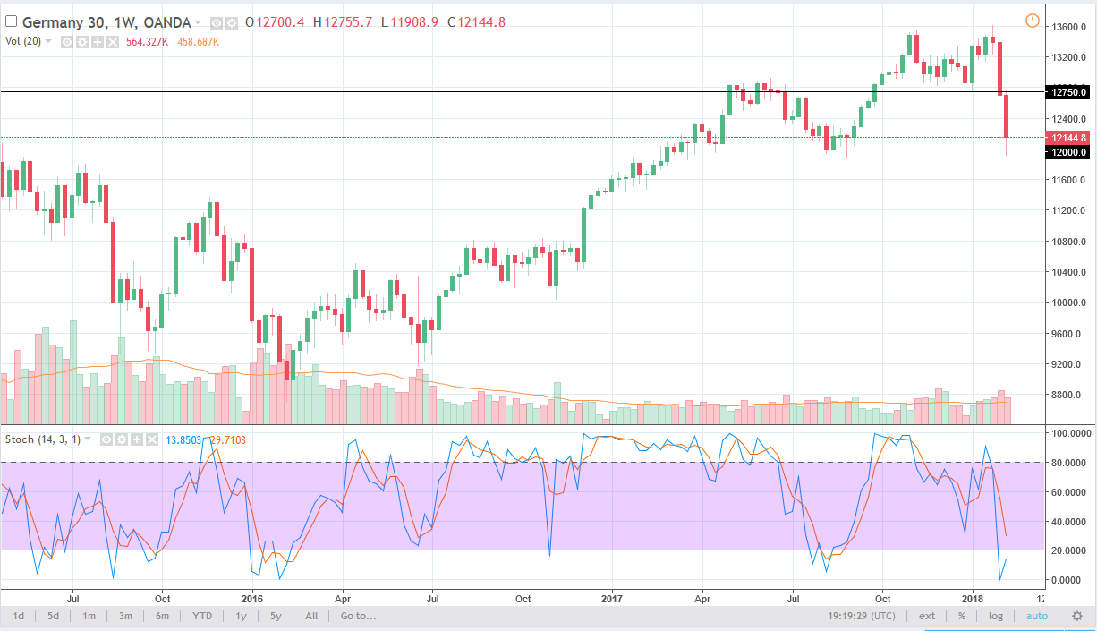 At this point, I think longer-term traders will be paying a lot of attention to the €12,000 level, and if we can stay above a, then buying is possible. Obviously, you should do it with a bit of caution, as it could cause a lot of noise. However, if we were to break down at this point I think it would be easy to see this market go down to the €10,800 level next. Quite frankly, stock markets around the world have been moving in sync, and I think that will continue to be the case. Currently, I think that we are due for a bounce, so I would not be surprised to see that happen. If we can break above the €12,750 level, the market could then go as high as €13,600 next. I prefer to buy the DAX, but I need to see a bit of stabilization before I do so.