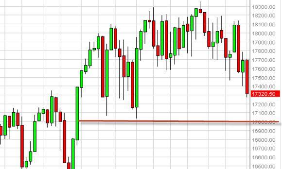 The Dow Jones 30 broke down during the course of the week, breaking below the 17,400 level, which of course was the bottom of last week’s range. With