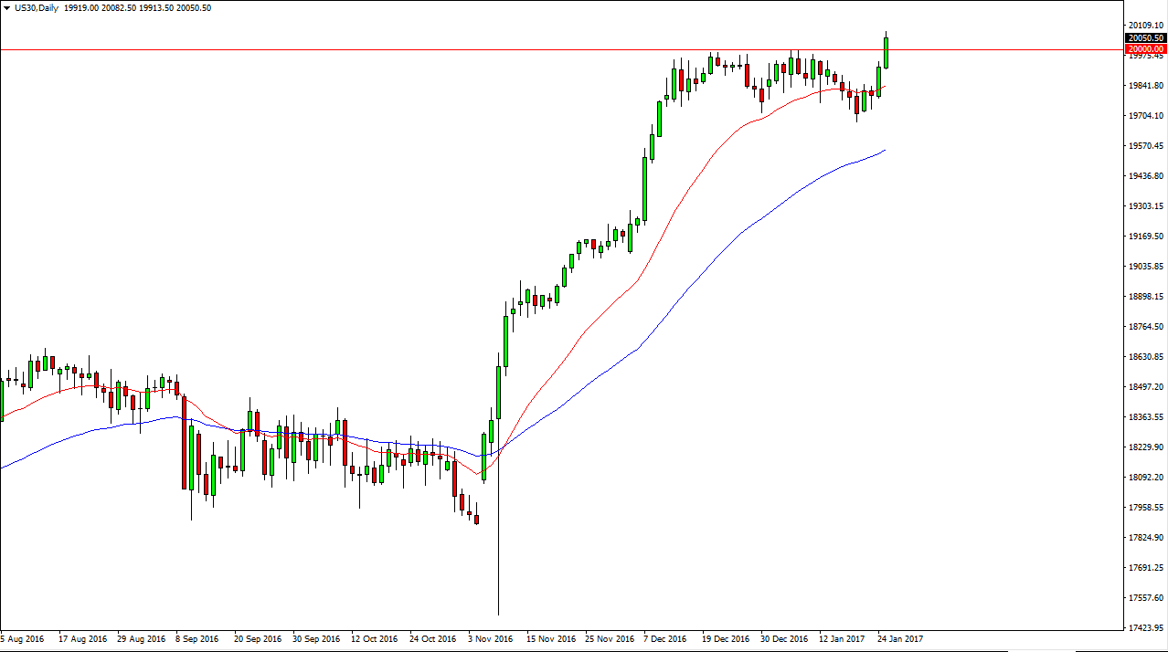 The Dow Jones 30 broke out above the 20,000 level during the day on Wednesday, signaling that we are going higher. I believe short-term pullbacks offer