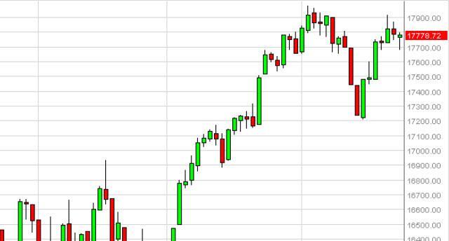 The Dow Jones 30 initially fell during the day on Tuesday, but turned around at the 17,700 level to form a bit of a hammer as we showed signs of support. Ultimately, we believe the market should continue to go higher, but will have to break above the 18,000 level to have real strength for longer-term moves. Pullbacks continue to have buyers show up below, so having said that it’s only a matter time before we start going long yet again. There is no interest on our part of selling this market until we get well below the 17,200 handle.