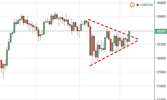 The Dow Jones 30 broke out to the upside during the course of the session on Monday, as we clear the top of the symmetrical triangle. I believe that we are going to run into a bit of resistance above, but given enough time pullbacks will continue to be buying opportunities as we grind towards the 18,600 level. I still believe that the 18,000 level below is going to continue to be the floor and that ultimately we will probably try to reach towards the 20,000 level over the longer term.