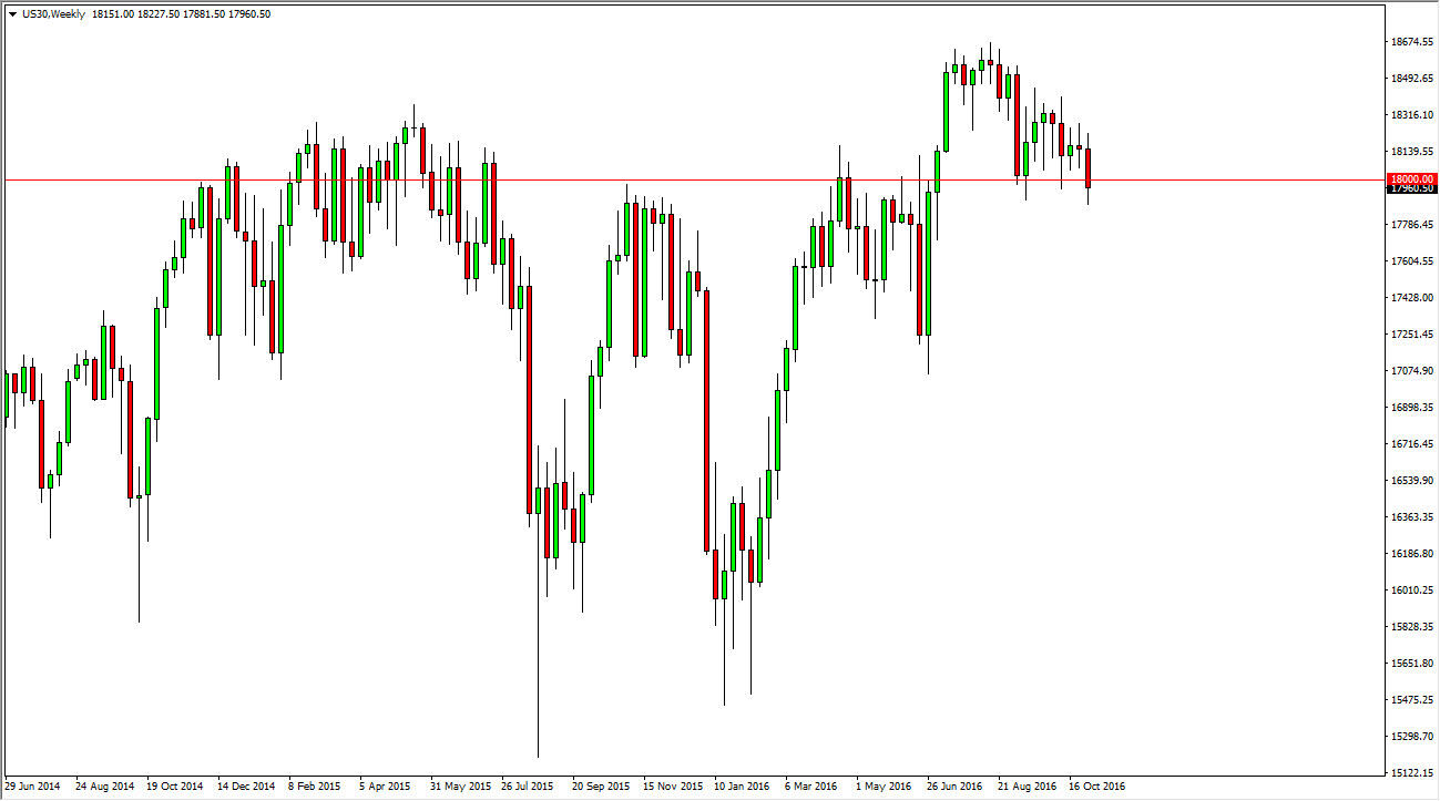 The Dow Jones 30 initially tried to rally during the week but turned around to form a relatively negative candle. However, we are sitting on top of a
