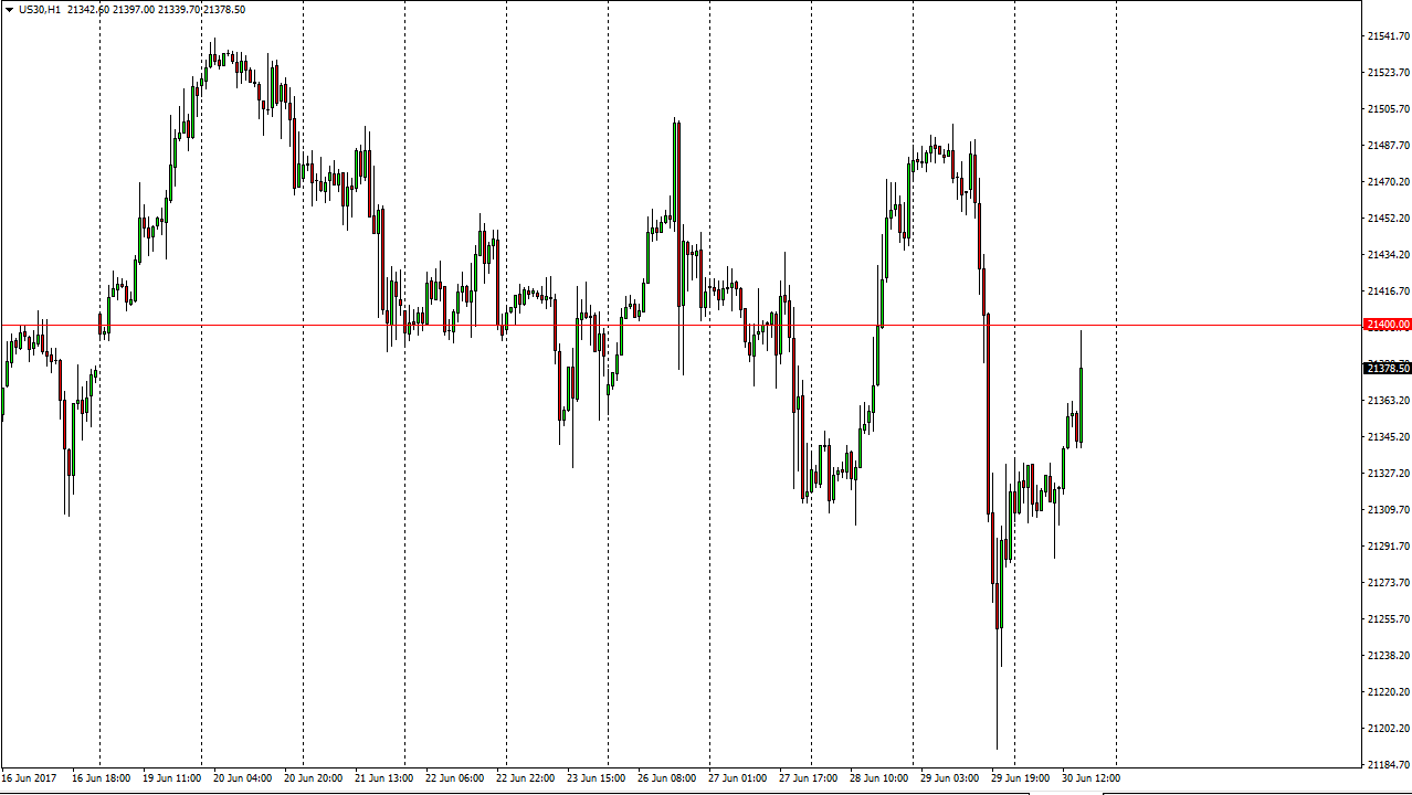 The Dow Jones 30 rallied on Friday, testing the 21,400 level. If we can break above that level, that would be a bullish sign. However, looks as if we are trying to turn things around and fall again. If we break down below the 21,300 level, I would be very concerned. Alternately, a breakout to the upside should send this market looking towards the 21,500 level.