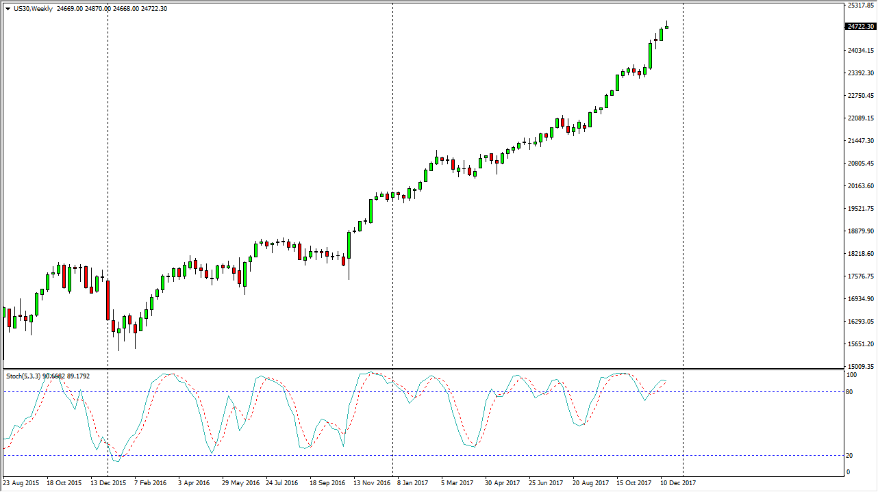 The Dow Jones 30 initially rally during the week, but turned around to form a shooting star which of course is a sell signal. Because of this, I think we have gotten a bit ahead of ourselves, and it’s likely that we may have a bit of a pullback during the illiquid time between Christmas and New Year’s, but I think that eventually we will find buyers coming back into the marketplace looking for value. We could shed a few hundred points, but quite frankly that’s not a big deal in this market. We are crossing in the weekly stochastic oscillator overbought range, so I think there are several reasons to think that we are going to struggle. Longer-term though, I am very bullish of the Dow Jones 30.