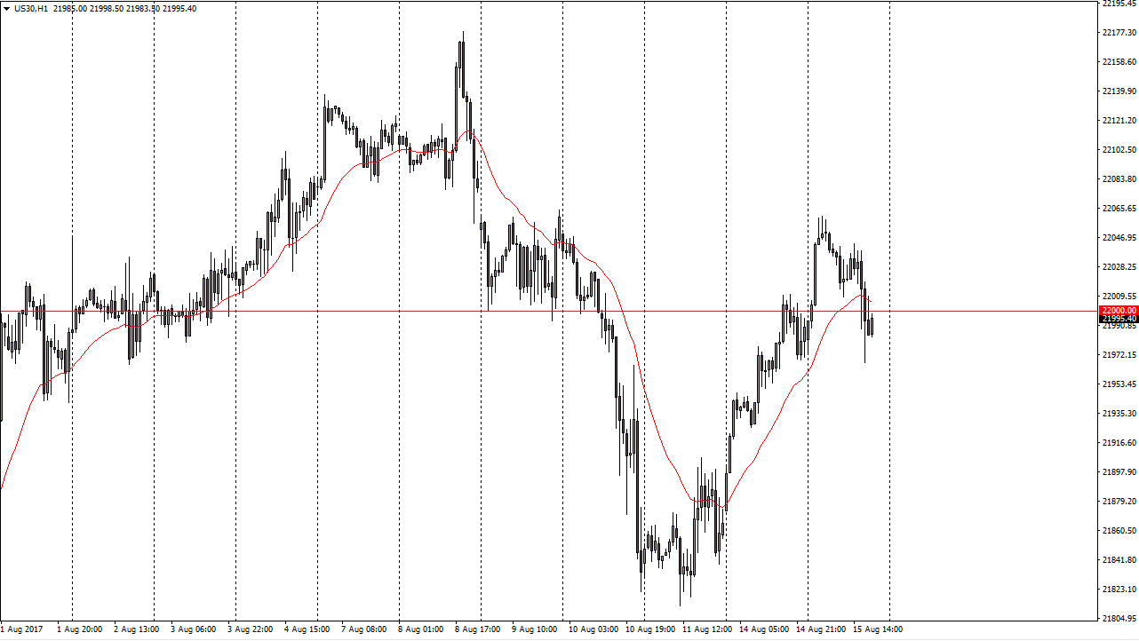 The Dow Jones 30 initially shot much higher during the day on Tuesday, slicing through the 22,000 level. However, we turned around at the 22,050 level, and broke below 22,000 again. If we can break above 22,000, and hold it on the daily close, I think that the market probably goes higher. Otherwise, we may need to pull back to build up enough momentum to continue the uptrend below. There is a lot of undercurrent in the marketplace that is swirling in both directions, so I do anticipate quite a bit of volatility.