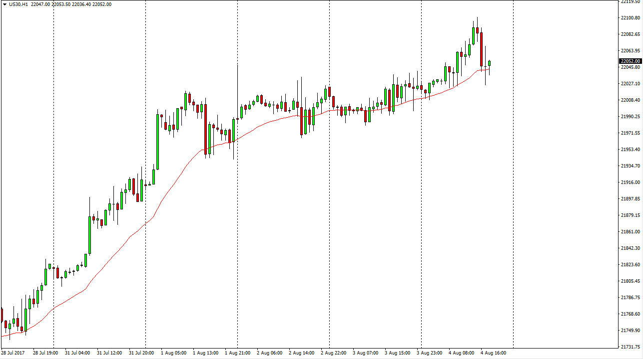 The Dow Jones 30 initially rally during the day on Friday but then turned around to fall after the jobs number came out stronger than anticipated. This is mainly because the Federal Reserve is likely to continue raising interest rates, but also shows resiliency in the market so it makes sense that the buyers return. I believe that the 22,000 level should now offer support, and that the market is going to continue to be a “buy on the dips” type of situation. A breakdown below the 22,000 level has be looking for support at lower levels. Quite frankly, this is a very strong market and one of my favorite ones that I follow.
