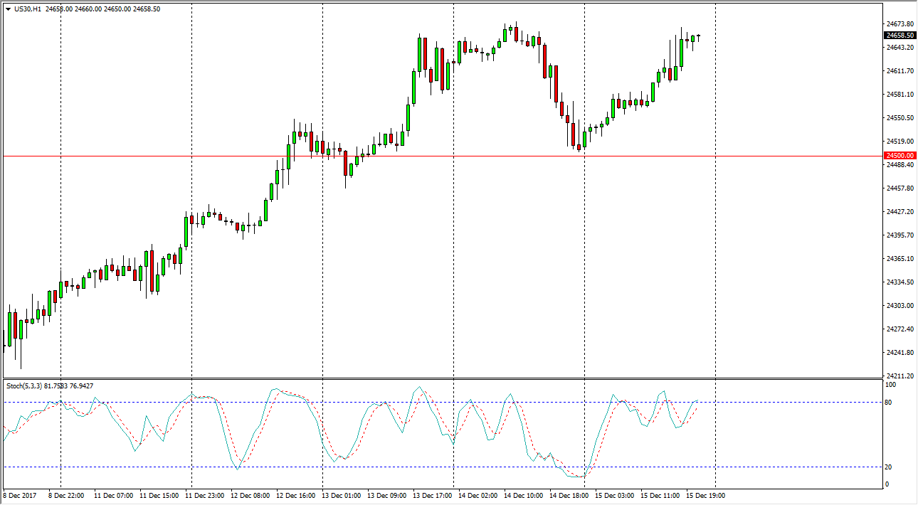 The Dow Jones 30 rally during the session after Mark a Rubio stated he would support the Republican tax plan, which all but ensures a passage of the bill. Because of this, corporate profits next year should be larger, thereby offering an opportunity for the market to continue showing signs of strength. I think that we will eventually go looking towards the 25,000 level above, which of course is a large, round, psychologically significant number. Buying on the dips should continue to be the play, and adding as you go along should be the best way to profit from what has been a strong move.