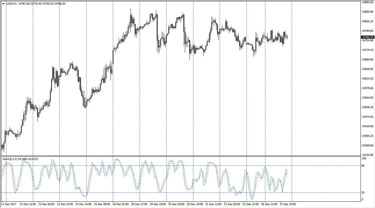 The NASDAQ 100 was very quiet initially during the trading session, but then eventually settled on a slightly negative session. I believe that the 6400-level underneath is the “floor” in the market, and looking at the stochastic oscillator it’s likely that we will go looking towards that area. Otherwise, we could turn around towards the 6450 handle, but at this point in the year, it’s very difficult put on large position, but I do recognize that the NASDAQ 100 is bullish overall and longer term, so I believe that the attitude of this market will continue to be the same going into 2018, so if you are more of a longer-term trader, you may be able to start building up a position slowly and add as it works out in your favor.