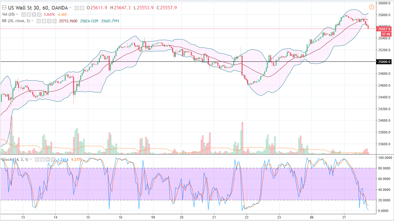 The Dow Jones 30 initially went sideways during trading on Tuesday, awaiting the comments out of Federal Reserve Chairman Jerome Powell. When he stated that interest rate hikes were coming still, despite the recent belief that perhaps they were going to be a put on hold, the stock markets fell. However, this should not be much of a surprise and I feel it’s only a matter of time before the buyers return to this market, looking to pick up a bit of value in a market that for me has a hard “floor” at the 25,000 level. Otherwise, I believe that we would “reset” somewhere closer to the 24,600 level.