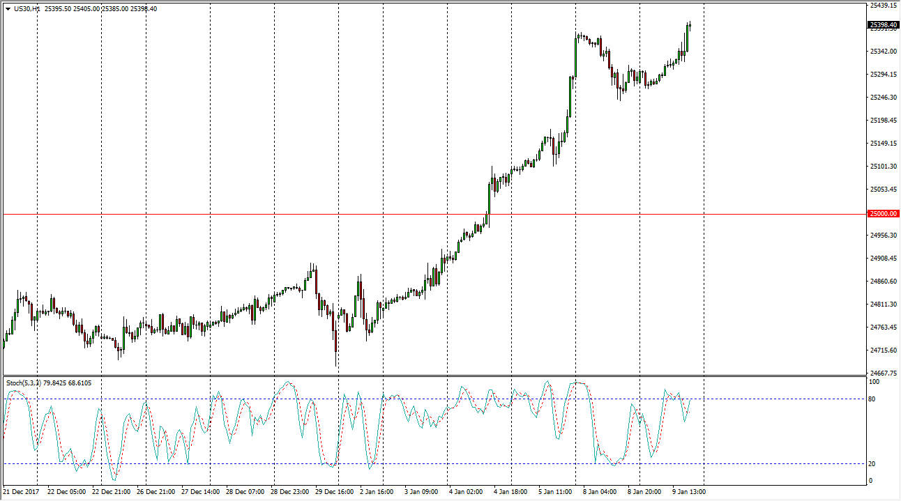 The Dow Jones 30 has made a “higher high” during the day on Tuesday, which always is a bullish sign. We are breaking above the 25,400 level, suggesting that we should go to the 25,500 level after that. I like buying dips, because they offer value in a market that is obviously very bullish. I suspect that the 25,000 level is now going to be the “floor” in the uptrend, and that we are ready to go much higher. The tax bill been signed in the United States helps a lot of the larger companies, which of course influences the Dow Jones 30, as these companies are the pinnacle of American business. I think that the 25,250 level is also going to be support, so short-term pullbacks between here there offer value.