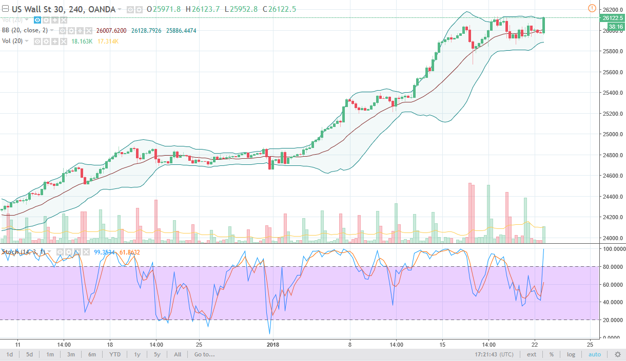 The Dow Jones 30 initially rally during the trading session on Monday, reaching towards the 26,150 handle. If we can break above there, the market should continue to go much higher, and if we pull back at any time, that should be a buying opportunity as I see a bit of a “short-term floor” at the 26,000 level. I think that pullbacks will continue to attract a lot of attention, but quite frankly we have seen volume pick up on a large green candle, and that tells me we may not even get the pullback. When you look at the 4-hour chart, you could make an argument for an ascending triangle, or some type of ascending wedge. Either way, it looks like dips offer value, and that we are going to continue to go much higher.