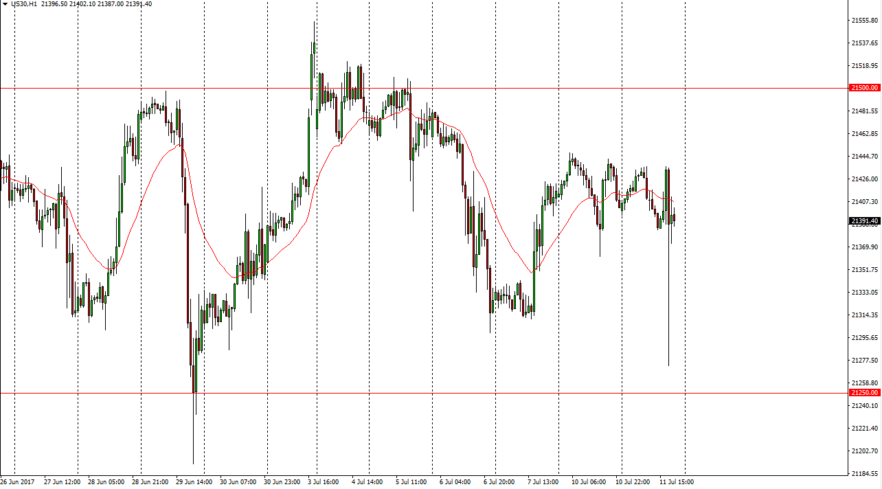 The Dow Jones 30 had a volatile session on Tuesday, as Donald Trump Junior was forced to release emails. This started the whole Russia investigation thing going again, and that of course has scared quite a few traders. However, you will see that we turned around to recover those losses, and at the end of the day we stayed within the range that we have been trading and on Monday as well. I think the market is simply in a “wait and see” mode, as Janet Yellen is speaking in front of Congress today. That should have an effect on what happens with stock markets as the world awaits to find out what Federal Reserve policy may end up being.