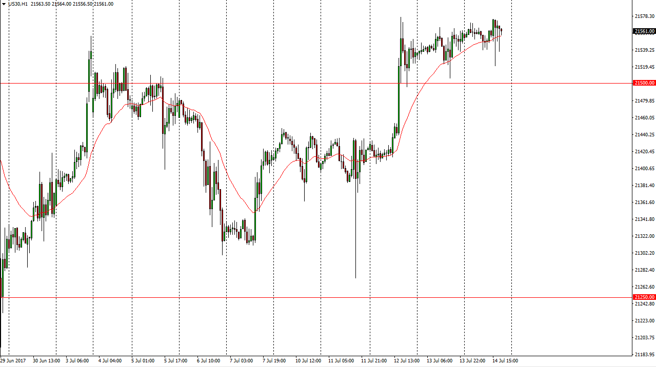The Dow Jones 30 went sideways initially during the session on Friday, testing the 24-exponential moving average, as the market looks likely to dance sideways overall. Every time we pull back though, there are buyers and we look as if we are bullish in general. I think eventually we could break out towards the 22,000 level, but it is going to take some bullish pressure to get there. I think that every time this market pulls back, it’s likely that there are buyers getting involved. Because of this, I believe that the 21,500 level continues to offer support. Ultimately, this market continues to be volatile, but I think eventually the buyers will run the show. Even if we break down below the 21,500 level, the market should see plenty of support at the 21,450 level. I have no interest in selling.