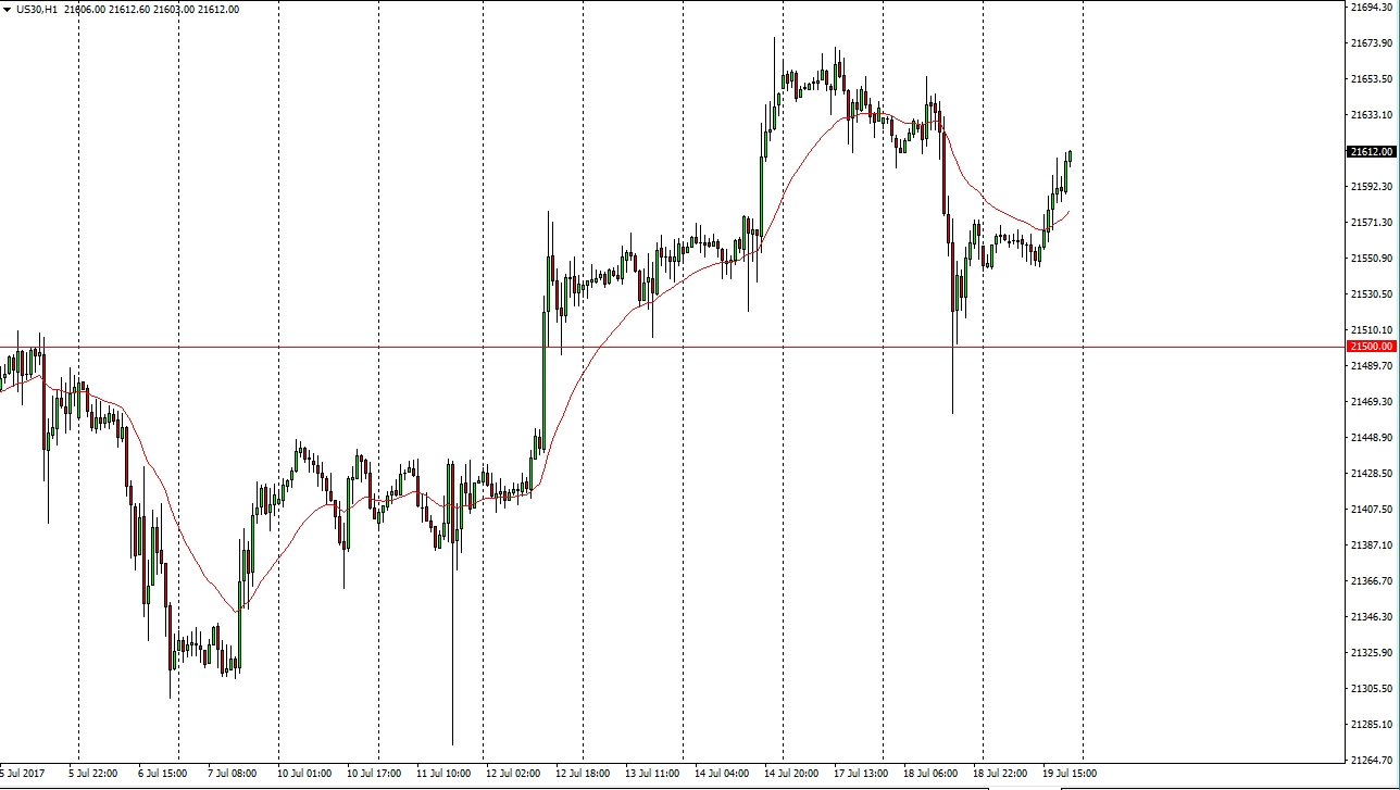 The Dow Jones 30 went sideways initially during the day on Wednesday, but then shot higher once the Americans came back. Because of this, looks like the Americans are ready to push the stock markets higher, and therefore I look at pullbacks as potential buying opportunities. Once we get those pullbacks, it’s likely that we will reach towards the 21,650 handle. A break above there should send the market to the 22,000 level. I think that the 21,500-level underneath should continue to be support, and essentially the “floor” in the market. Given enough time, I think that the market should show volatility, but upwards volatility more than anything else.