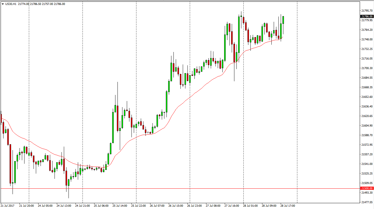 The Dow Jones 30 initially fell during the day on Friday, but found a bit of support at the 21,750 level. It looks as if the market is ready to continue going higher, but we may have a bit of grinding to do. Overall, we have been in a bullish trend, and of course the US stock markets continue to benefit due to the dovish Federal Reserve. I believe that the earnings season has gone well, so that should continue to put upward pressure in this market as well. Pullbacks offer buying opportunities as the Dow Jones 30 continues to grind to the upside overall. Selling isn’t a thought, and I believe that we will be reaching towards the 22,000 level relatively soon.