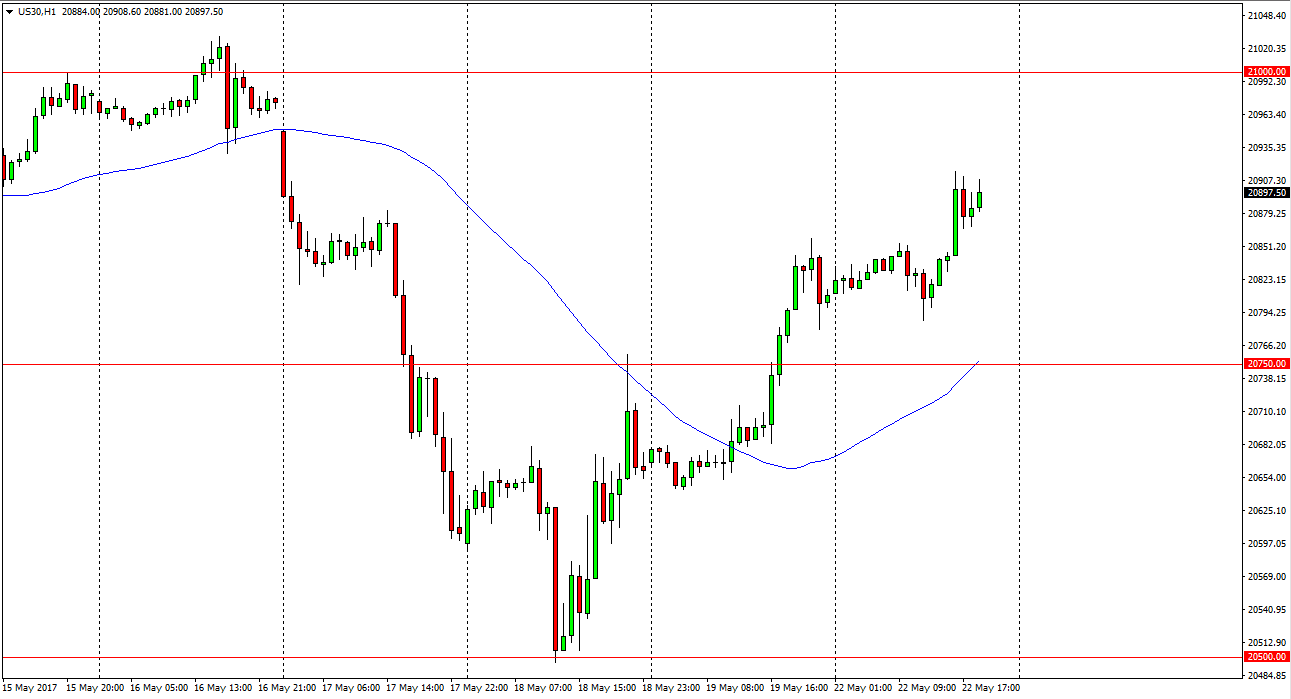 The Dow Jones 30 had a bullish session as the Americans came back to work on Monday. By showing the strength and breaking above the cluster of resistance at the 20,850 level, I think that the buyers are going to be coming back into the market when we dip on short-term charts. We have yet to fill the gap from 4 sessions ago, which sits at roughly 20,975. I don’t see the reason we don’t do that, and quite frankly I expect this market break out to fresh, new highs given enough time. I look at pullbacks as value in this market, especially near the 20,850 level, as earnings season has panned out reasonably well for a marketplace that is highly driven on a handful of blue-chip stocks. Once we break out to the upside, the market should continue its long grind higher.