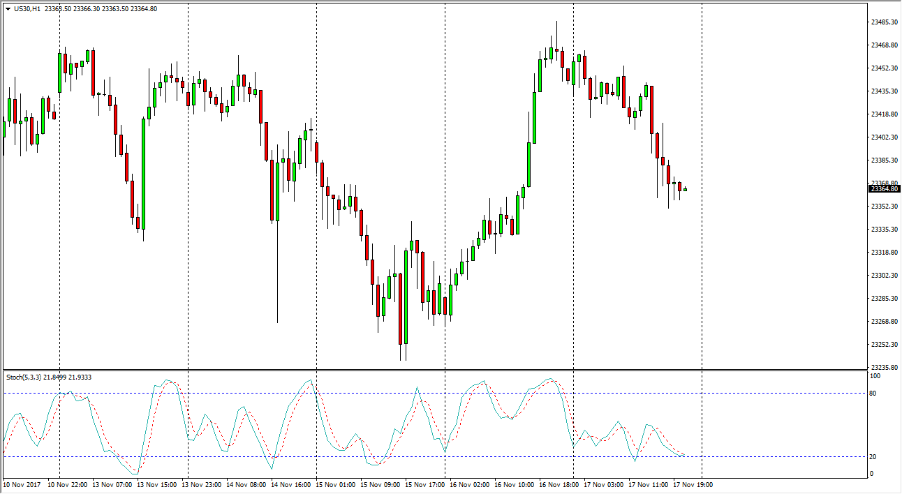 The Dow Jones 30 had a rough session on Friday, dropping down towards the 23,350 level. The market looks likely to see some support in this area, and on the stochastic oscillator, we have dropped enough to reach towards the oversold condition, and perhaps getting ready to cross over. That being the case, I think that buying is probably the best way to go in this general vicinity, but perhaps we may even drop further. The lower we go, the more likely it is going to offer us value that we can take advantage of. I believe that we are in a bit of a “holding pattern”, as we await the U.S. Congress to do its job. Tax bills are difficult but necessary to extend the profitability of US companies.