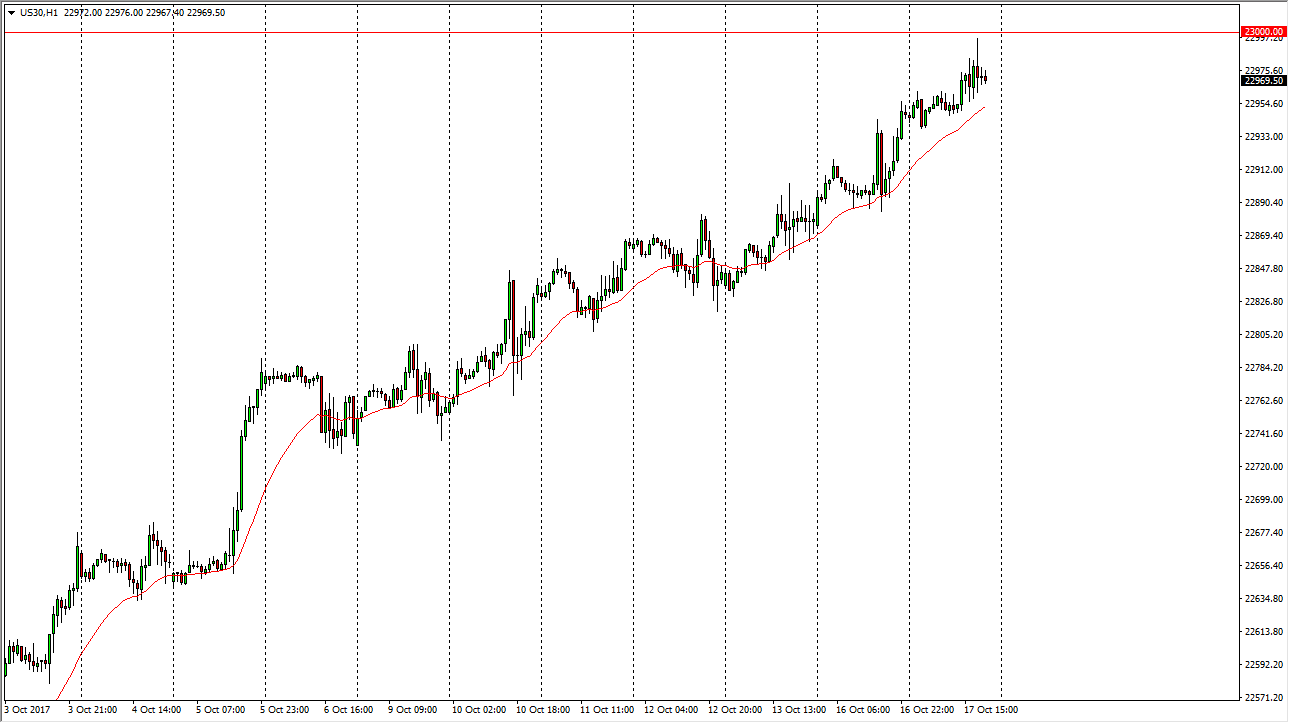 The Dow Jones 30 when hired during the session on Tuesday, reaching towards the 23,000 level above. That’s an area where we have seen a bit of resistance, as it is a large, round, psychologically significant number. The market looks likely to pull back from here, but I think that it’s only a matter of time before the buyers come back and push this market above that level. Once we clear the 23,000 level, the market should continue to go even higher. The 24-hour exponential moving average has been very reliable as dynamic support, and I think that it’s only a matter of time before we find a reason to go higher. Earnings season, of course, continues to do quite well, and that should eventually have traders jumping into the marketplace yet again as the upward momentum continues.