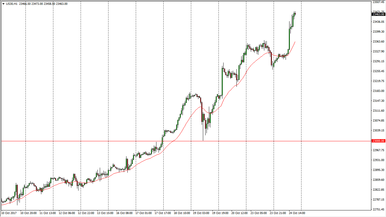 The Dow Jones 30 rallied slightly during the day on Tuesday but then exploded to the upside as Caterpillar had better than anticipated earnings, being a catalyst for more bullish pressure in the market. I believe that short-term pullbacks continue to be buying opportunities, and quite frankly the market looks all but set on going to the 23,500 level above. I believe that we should continue to see support near the 23,250 level, as the market has been continuing to find one reason after another to go higher. I will be the first to say that we are overdone, so longer-term traders are probably looking for pullbacks to take advantage of as they would offer value. I have no interest in shorting this market, pullbacks will be looked at with suspicion, and the first signs of support will probably be bought by algorithmic traders.
