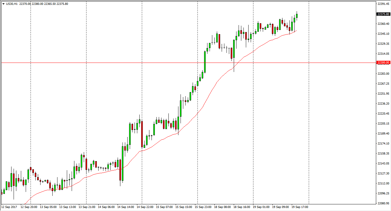 The Dow Jones 30 went sideways during most of the session on Tuesday, but started to see buyers jump into the market later in the day. This is a continuation of the uptrend that we have seen for some time, and I believe that we continue to find support below at the 22,300 level. Ultimately, the market should then go to the 22,500 level above. Pullbacks offer value, and I believe that with the Federal Reserve meeting today and having a statement come out, it’s likely that we will see dovish statements coming from the Fed, giving us an opportunity to have cheap money going forward. Ultimately, that should send stocks higher as the bond returns simply won’t be there to be had. I like buying dips in this market, and I believe that we are going to go looking for the aforementioned 22,500 level.