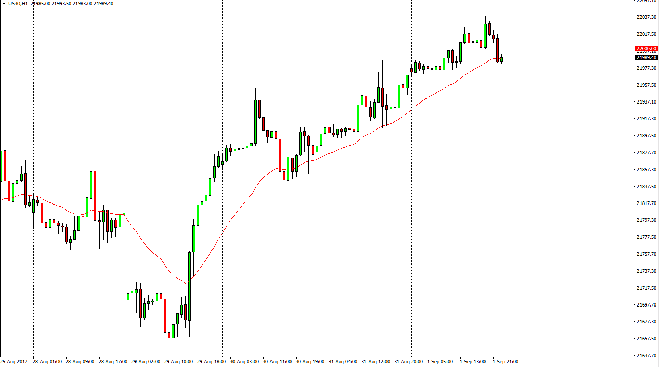 The Dow Jones 30 had a volatile session on Friday, as one would expect with that being the jobs report number. A lot of profit-takings was the culprit towards the end of the day as the market ended up flat. That being the case, it looks like the 22,000 level is going to cause issues again, but a break above the highs of the session would be reason enough to start buying again. The weekly candle is very strong, so I believe that ultimately the buyers will return on dips as they offer value. I have no interest in shorting anytime soon as the momentum is most certainly to the upside.