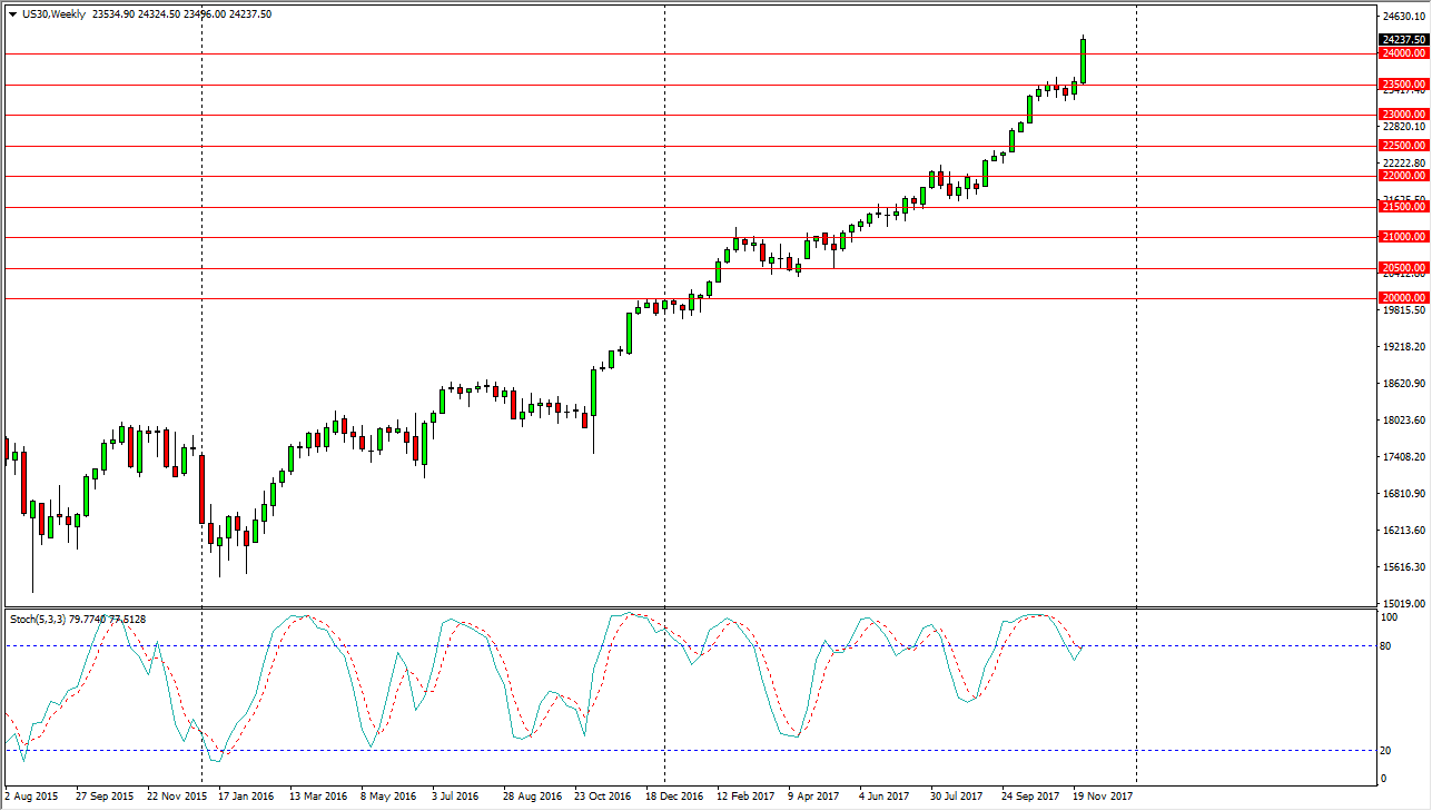 The Dow Jones 30 broke out during the week, breaking above the 24,000 level again. By closing towards the top of the candle, it looks as if we are ready to continue the bullish run higher, and currently, it looks as if the 23,500 level is a bit of a floor. Obviously, algorithmic traders come in and pick up every short-term pullback, and I think that there is plenty of support at various levels underneath, so given enough time I think that the market will eventually go looking towards the 25,000 level, which is the next major round number. Expect the “Santa Claus rally” to come in full effect, but we do have a lot of volatility due to the General Flynn announcement during the Friday session that he was willing to testify against the White House.