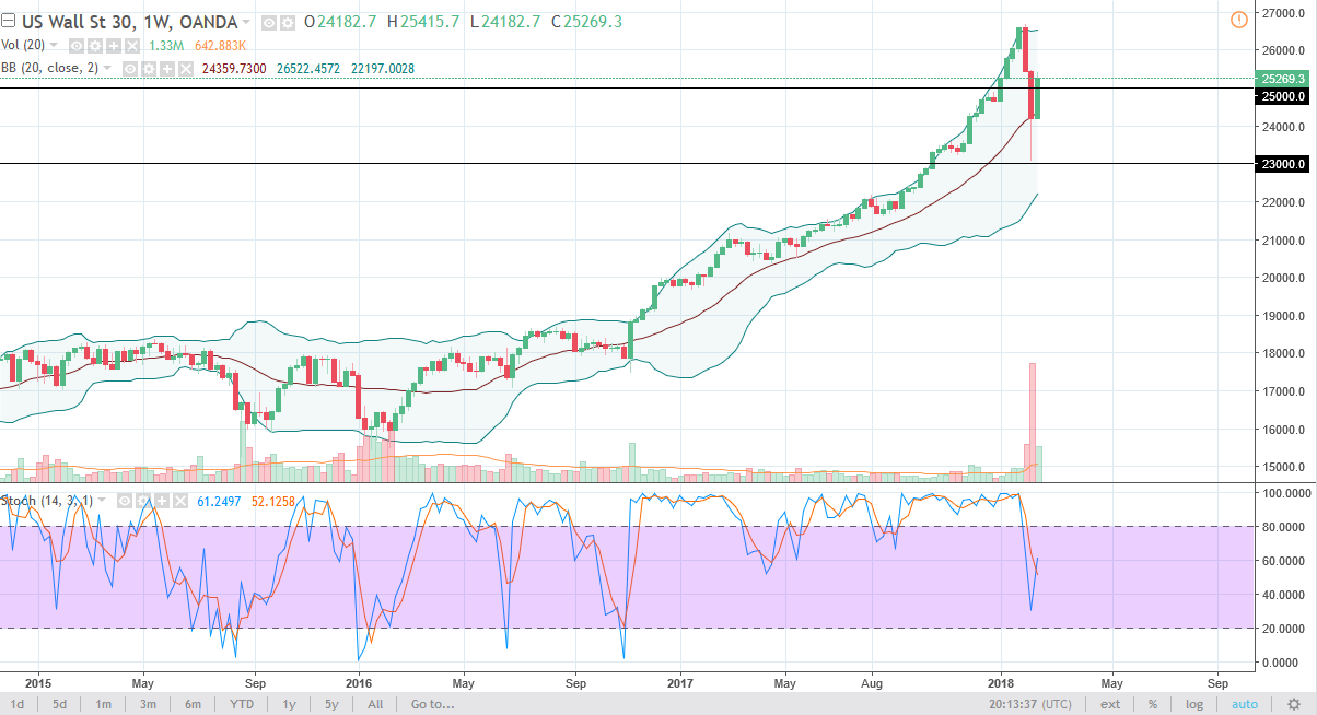 The Dow Jones 30 has broken out to the upside again during the week, wiping out most of the losses from the previous week. By doing so, and breaking above the 25,000 handle, it looks as if the Dow Jones 30 is ready to go higher, perhaps reaching towards the 27,000 region again. If we were to break down below the 23,000 level, the market could break down significantly, perhaps reaching down to the 20,000 level, but at this point I think it’s more likely that the buyers jump in as we have seen algorithmic trader’s pickup pullbacks as they suggest value.