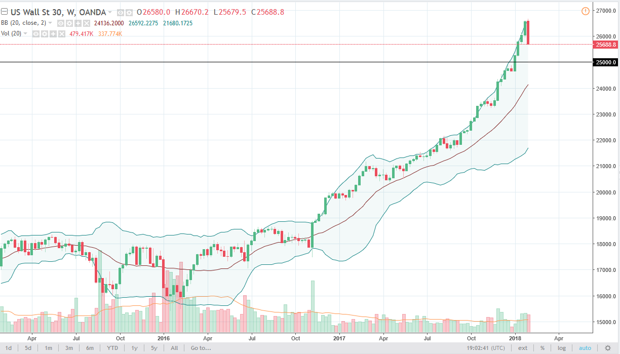 The Dow Jones 30 has broken down during the week, showing signs of weakness. A lot of this is due to the market being overbought, and it looks likely that the market is going to go looking towards support underneath, which I see a in the form of 25,000. That’s a large, round, psychologically significant number, and of course an area that was previous resistance. I think that the market will find support there as it will offer “market memory.” A bounce from there would make a lot of sense, but even if we do break down below there, I think there’s also support at the 24,000 level.
