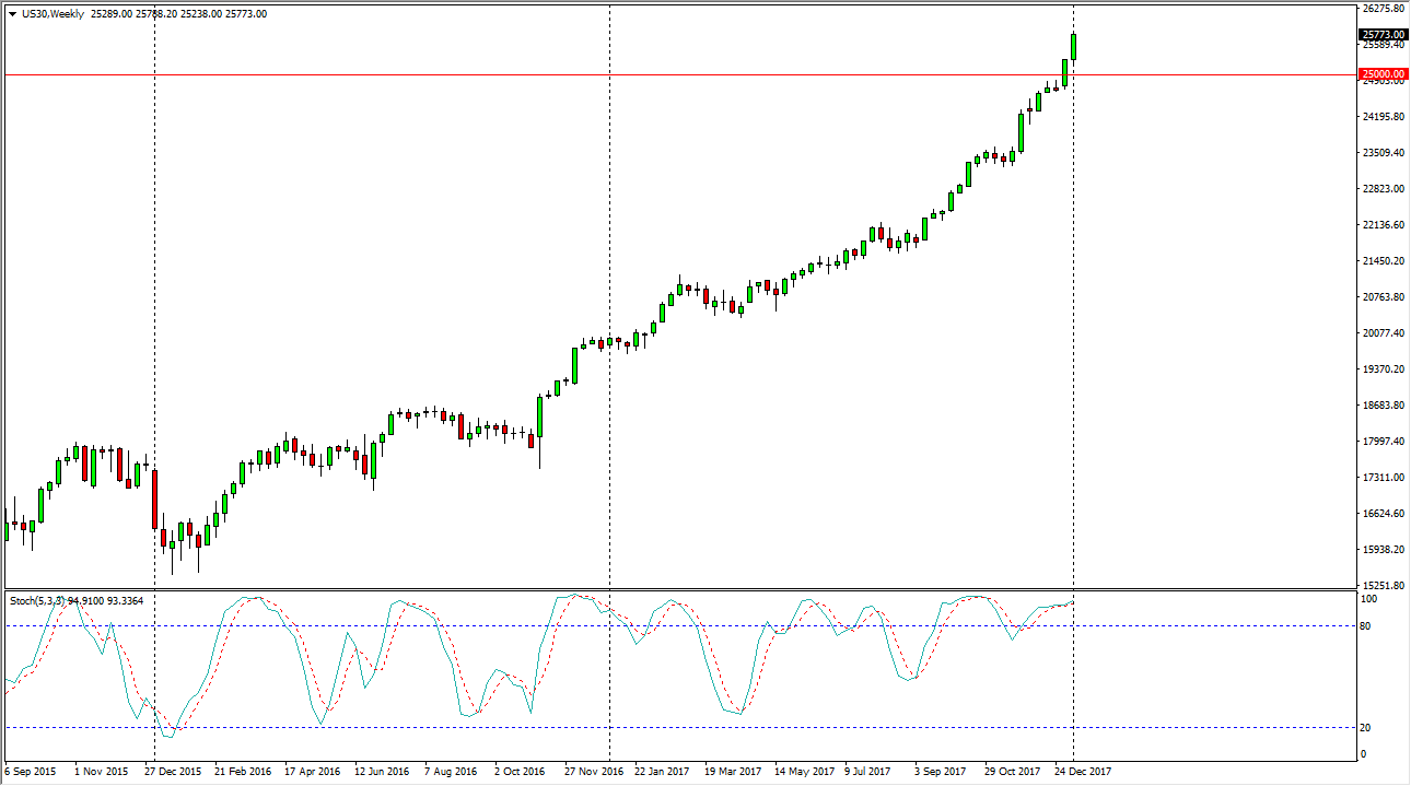 The Dow Jones 30 broke out to the upside yet again during the week, as we are touching fresh new highs on Friday. The market has gotten a bit overextended, but quite frankly I think that pullbacks will continue to be a buying opportunity. The 25,000 level should now offer a hard “floor”, and should be the basis of any move on a bounce. Longer-term, I don’t see the reason why we drop from here and with the significant drop in the value of the US dollar, I think that the Dow Jones 30 will continue to rally.