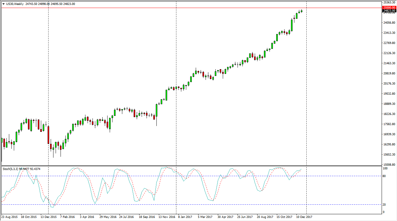 The NASDAQ 100 was also very positive for the year, but we pulled back a bit during this week, reaching towards the 6400 level. The shooting star from the previous week suggested that we were to pull back, but I think there is a certain amount of support in the 6400 level, and we also have an uptrend going on in the form of the channel, so I believe it’s only a matter of time before the buyers get involved. I like buying the NASDAQ 100, but we need to see it on short-term charts such as a daily timeframe, as it can fine tune our move. Given enough time, I think we break above the 6500 level.